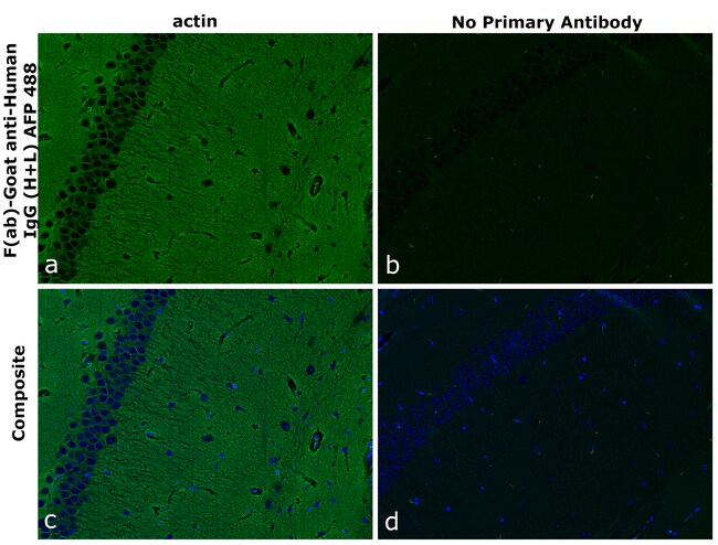 F(ab)-Goat anti-Human IgG (H+L) Superclonal™ Recombinant Secondary Antibody, Alexa Fluor™ Plus 488 detects all subtypes of Human IgG with moderate cross reactivity to Rat IgG and Monkey IgG. No cross-reactivity was observed towards other species of immunoglobulins tested. This Fab fragment antibody is expressed in vitro and purified as a recombinant construct. It is also engineered to deliver enhanced stability and sensitivity. The advantages of recombinant antibodies include-better specificity, animal origin-free formulation, and lot-to-lot consistency. F(ab) fragments offer several advantages over full-length IgGs due to their smaller molecular size (~50 kDa vs. ~150 kDa), such as improved tissue penetration. The absence of the Fc region reduces nonspecific binding and background staining in Fc receptor-expressing cells and tissues, while also enabling increased flexibility in multiplexing assays. Alexa Fluor™ Plus dyes have been chemically optimized to provide higher signal to noise ratios and minimized cross-reactivity to help detect low-abundance targets in rare or precious samples. It is recommended that the antibody be carefully titrated for optimal performance in the assay of interest.