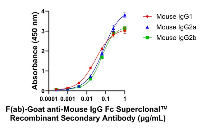 F(ab)-Goat anti-Mouse IgG Fc Superclonal™ Recombinant Secondary Antibody is very specific to Mouse Fc region and can detect Mouse IgG1,2a,2b. It showed no cross-reactivity to various species immunoglobulins tested This Fab fragment antibody is expressed in vitro and purified as a recombinant construct. It is also engineered to deliver enhanced stability and sensitivity. The advantages of recombinant antibodies include-better specificity, animal origin-free formulation, and lot-to-lot consistency. F(ab) fragments offer several advantages over full-length IgGs due to their smaller molecular size (~50 kDa vs. ~150 kDa), such as improved tissue penetration. The absence of the Fc region reduces nonspecific binding and background staining in Fc receptor-expressing cells and tissues, while also enabling increased flexibility in multiplexing assays. It is recommended that the antibody be carefully titrated for optimal performance in the assay of interest.