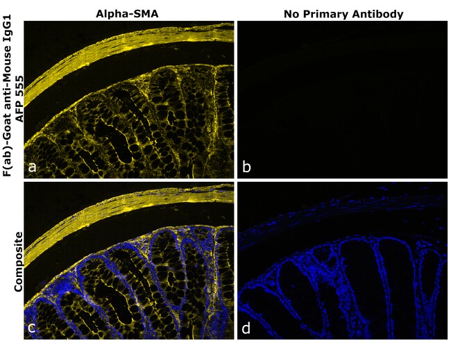 F(ab)-Goat anti-Mouse IgG1 Superclonal™ Recombinant Secondary Antibody, Alexa Fluor™ Plus 555 is very specific to Mouse IgG1 with no cross reactivity to Mouse IgG2a, Mouse IgG2b and Mouse IgG3. It showed minimum cross reactivity to Rabbit IgG, Rat IgA and no cross-reactivity to various species immunoglobulins tested. This Fab fragment antibody is expressed in vitro and purified as a recombinant construct. It is also engineered to deliver enhanced stability and sensitivity. The advantages of recombinant antibodies include-better specificity, animal origin-free formulation, and lot-to-lot consistency. F(ab) fragments offer several advantages over full-length IgGs due to their smaller molecular size (~50 kDa vs. ~150 kDa), such as improved tissue penetration. The absence of the Fc region reduces nonspecific binding and background staining in Fc receptor-expressing cells and tissues, while also enabling increased flexibility in multiplexing assays. Alexa Fluor™ Plus dyes have been chemically optimized to provide higher signal to noise ratios and minimized cross-reactivity to help detect low-abundance targets in rare or precious samples. It is recommended that the antibody be carefully titrated for optimal performance in the assay of interest.
