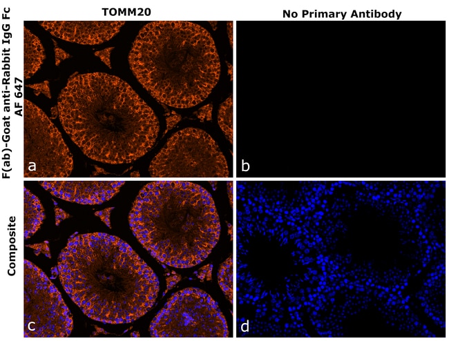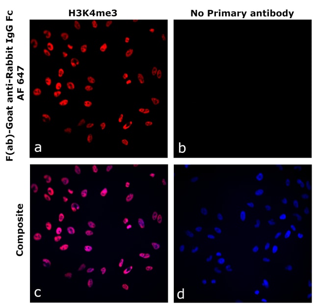 F(ab)-Goat anti-Rabbit IgG Fc Recombinant Secondary Antibody, Alexa Fluor™ 647 is specific to Rabbit IgG Fc fragment. It showed no cross-reactivity to various species immunoglobulins tested except for <10% reactivity towards Human IgG, Monkey IgG and Donkey IgG. This Fab fragment antibody is expressed in vitro and purified as a recombinant construct. It is also engineered to deliver enhanced stability and sensitivity. The advantages of recombinant antibodies include-better specificity, animal origin-free formulation, and lot-to-lot consistency. F(ab) fragments offer several advantages over full-length IgGs due to their smaller molecular size (~50 kDa vs. ~150 kDa), such as improved tissue penetration. The absence of the Fc region reduces nonspecific binding and background staining in Fc receptor-expressing cells and tissues, while also enabling increased flexibility in multiplexing assays. Protein conjugates made with Alexa Fluor™ dyes produce fluorescence output that surpasses that of other spectrally similar fluorophore-labeled proteins. Alexa Fluor™ dyes are available in a wide selection of fluorescent colors and are more photostable than most other dyes. Photostability is a key characteristic of Alexa Fluor dye™ conjugates, allowing more time for image capture. In addition to their exceptional brightness and the wide selection of dyes across the spectrum, you'll get photostability you can rely on with Alexa Fluor™ dyes and dye conjugat....