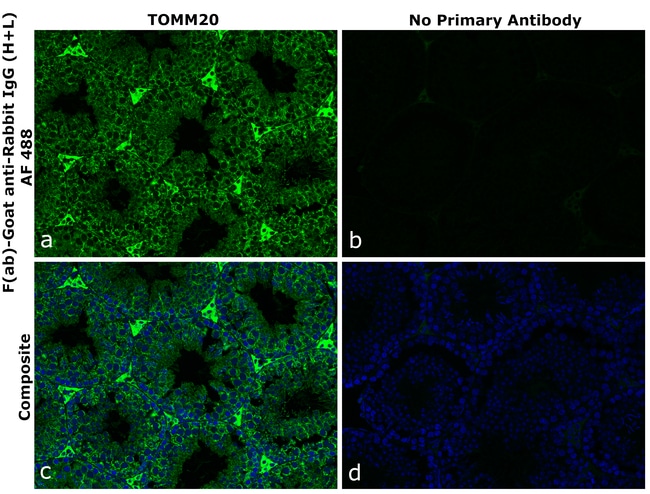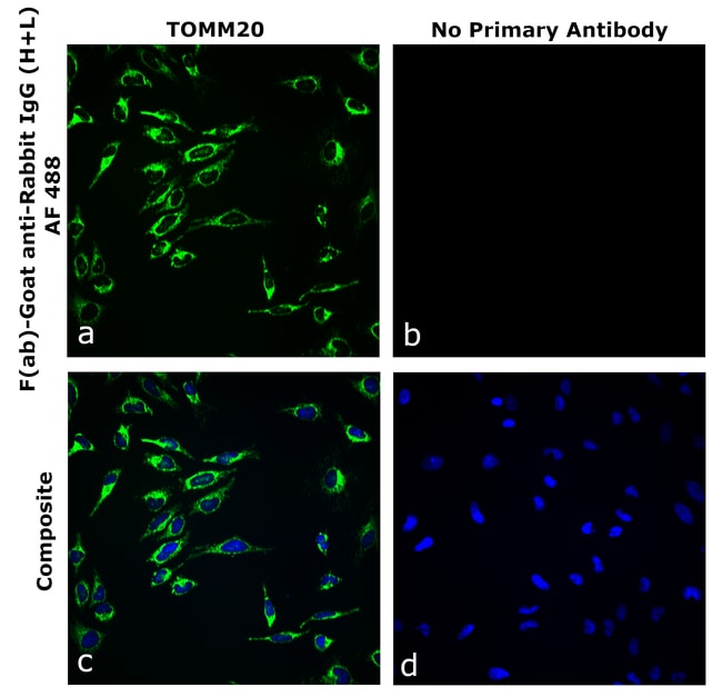 F(ab)-Goat anti-Rabbit IgG (H+L) Superclonal™ Recombinant Secondary Antibody, Alexa Fluor™ 488 can detect both Rabbit Fab2 and Fc fragment of Rabbit IgG. It showed no cross-reactivity to various species immunoglobulins tested. This Fab fragment antibody is expressed in vitro and purified as a recombinant construct. It is also engineered to deliver enhanced stability and sensitivity. The advantages of recombinant antibodies include-better specificity, animal origin-free formulation, and lot-to-lot consistency. F(ab) fragments offer several advantages over full-length IgGs due to their smaller molecular size (~50 kDa vs. ~150 kDa), such as improved tissue penetration. The absence of the Fc region reduces nonspecific binding and background staining in Fc receptor-expressing cells and tissues, while also enabling increased flexibility in multiplexing assays. Protein conjugates made with Alexa Fluor™ dyes produce fluorescence output that surpasses that of other spectrally similar fluorophore-labeled proteins. Alexa Fluor™ dyes are available in a wide selection of fluorescent colors and are more photostable than most other dyes. Photostability is a key characteristic of Alexa Fluor dye™ conjugates, allowing more time for image capture. In addition to their exceptional brightness and the wide selection of dyes across the spectrum, you'll get photostability you can rely on with Alexa Fluor™ dyes and dye conjugates. It is recommended that the ant...
