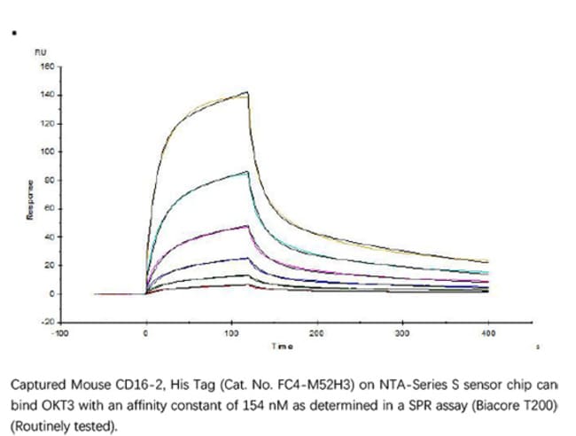 Recombinant Protein;1MG;Mouse CD16-2, His Tag (FC4-M52H3) is expressed from human 293 cells (HEK293). It contains AA Gly 21 - Gln 203 (Accession # A0A0B4J1G0-1).;This protein carries a polyhistidine tag at the C-terminus. The protein has a calculated MW of 22.8 kDa. The protein migrates as 28-35 kDa under reducing (R) condition (SDS-PAGE) due to glycosylation.;Captured Mouse CD16-2, His Tag (Cat. No. FC4-M52H3) on NTA-Series S sensor chip can bind OKT3 with an affinity constant of 154 nM as determined in a SPR assay (Biacore T200) (Routinely tested).