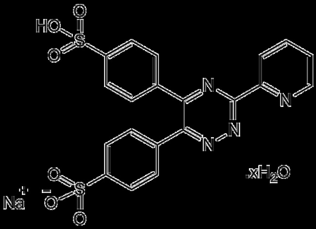 Chemical. CAS: 1266615-85-3 (xH2O)63451-29-6 (H2O)69898-45-9. Formula: C20H13N4NaO6S2 . xH2O. MW: 492.46 (anydrous basis). Ferrozine is a chelating agent for ferrous iron commonly used as a colorimetric reagent in the detection of iron. Ferrozine forms a complex with ferrous iron that can be quantified by colorimetric detection at 562nm as a measure of iron concentration. Ferrozine is used for the accurate determination of submicrogram levels of serum iron (pH 3.5-4.5, lambdamax 562nm, A 29′000) and has been used in ferrozine chromogen solutions, bioluminescence assays and in the measurement of Fe2+ concentration in the reaction medium.