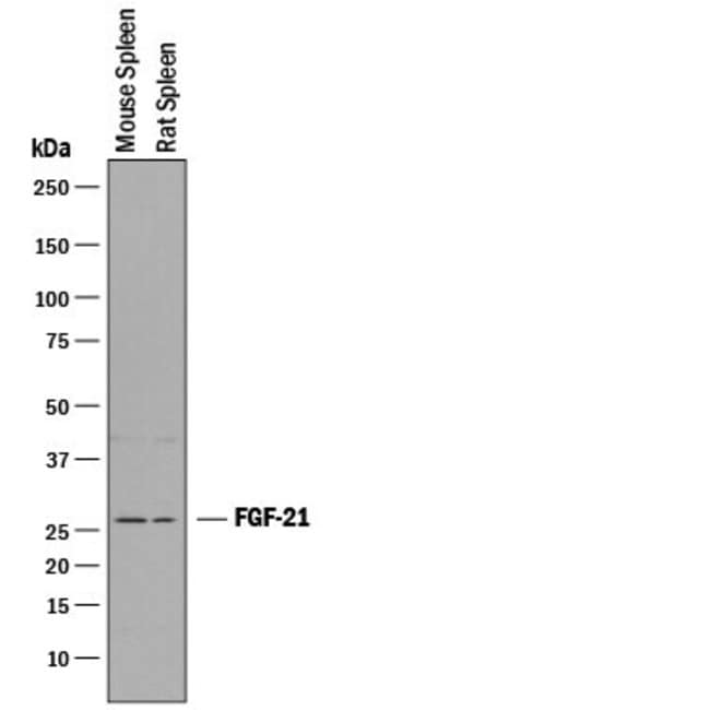 Approximately 15% cross-reactivity with recombinant human (rh) FGF-21 is observed and less than 1% cross-reactivity with rhFGF-19 and rhFGF-23 is observed. Reconstitute at 0.2 mg/mL in sterile PBS. Endoxin level is <0.10 EU per 1 μg of the antibody by the LAL method.