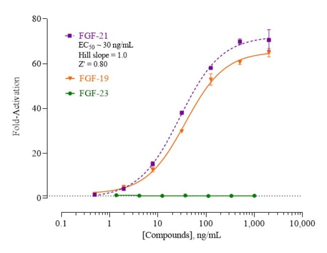 Eliminate weeks of cell culture while achieving superior sensitivity with reproducible results from this all-inclusive cell-based luciferase reporter assay. INDIGO’s Human Fibroblast Growth Factor Receptor 1c and β-Klotho reporter assay allows you to quickly screen test samples to quantify functional activity, either agonist or antagonist, they may exert against FGFR/β-Klotho. Kit includes cryopreserved reporter cells engineered to provide constitutive expression of the receptor, optimized media for use during cell thawing and in diluting test samples, reference agonist, Luciferase Detection Reagent, cell culture-ready assay plate, and detailed assay protocol. INDIGO’s unique Cryomite™ process provides exceptional cell viability post-thaw and INDIGO’s strict QA process means consistent results lot to lot (product quality data available upon request). This kit allows researchers to achieve superior sensitivity, clear, reproducible results, and eliminate weeks of cell culture work.