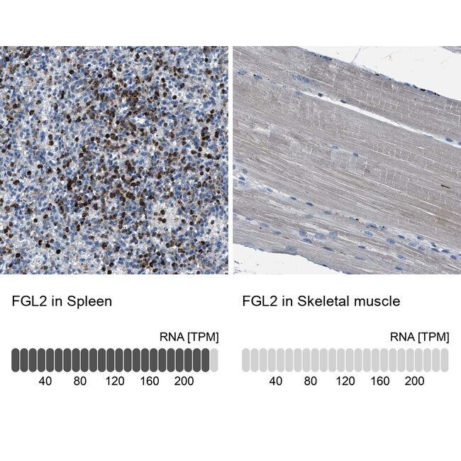 Fibrinogen-like protein 2 (Fgl2), also known as fibroleukin, is secreted by T cells and is involved in diseases in which thrombosis plays a pivotal role, such as virus-induced fulminant hepatitis, fetal loss syndrome and xenograft rejection. Constitutively expressed in cytotoxic T cells, Fgl2 exerts immunosuppressive effects on both T cell proliferation and dendritic cell maturation. Fgl2 is a serine protease and directly cleaves prothrombin to thrombin. Fgl2 functions in the pathogenesis of diseases including viral-induced hepatitis and Th1 cytokine-induced fetal loss syndrome.