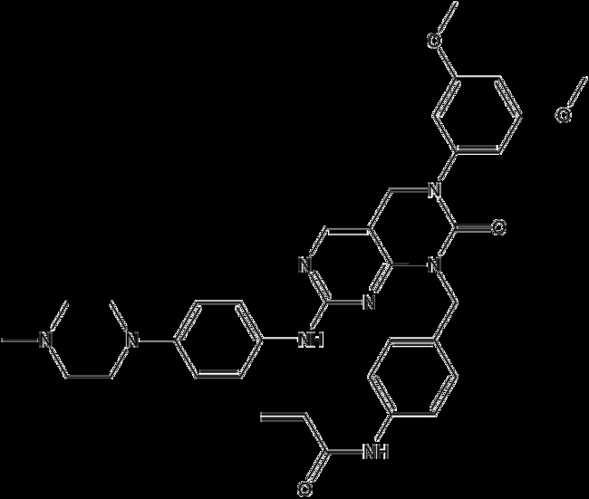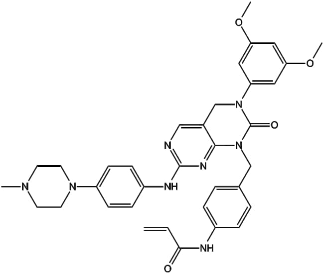 FIIN-2 (CAS 1633044-56-0) is an irreversible inhibitor targeting FGFR1 4 exhibiting IC50 values of 3 1 4 3 27 and 45 nM respectively It binds covalently to the P-loop cysteine particularly Cys491 in FGFR2 and displays moderate inhibition of EGFR (IC50 204 nM) with reduced affinity compared to related compounds FIIN-2 effectively inhibits proliferation of FGFR-dependent Ba/F3 cells showing nanomolar EC50 values and demonstrates potent activity against FGFR2 gatekeeper mutations including V564M and V564F Its selective kinase profile and ability to circumvent resistance mechanisms highlight its value for studying FGFR-driven oncogenic pathways and evaluating strategies for overcoming therapeutic resistance