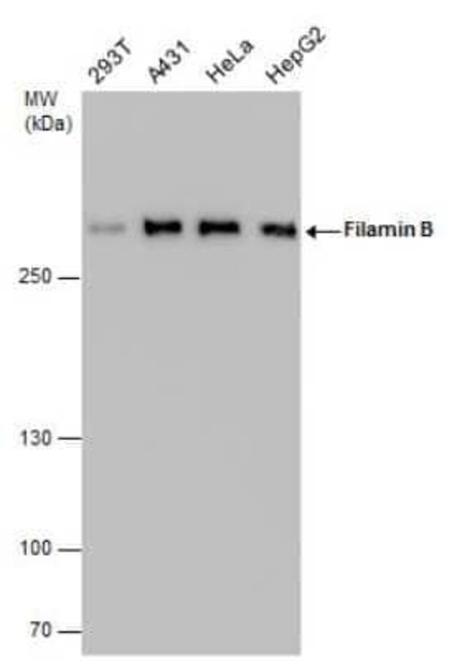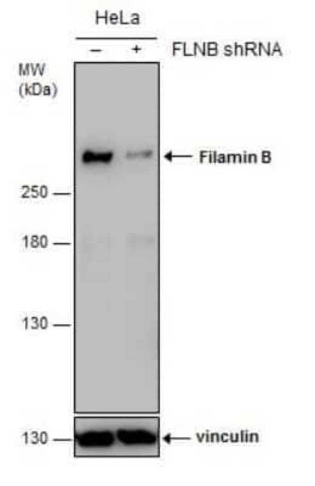 | Immunogen | Recombinant protein encompassing a sequence within the N-terminus region of human Filamin B. The exact sequence is proprietary. |