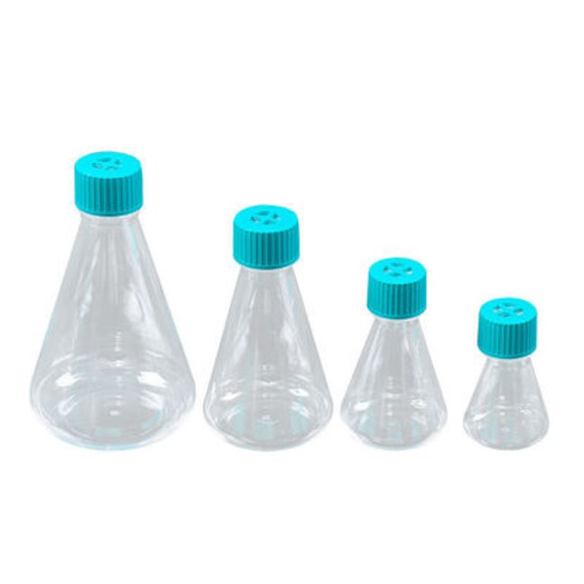 Sterile 500 mL polycarbonate Erlenmeyer flask supplied nest-packed and individually bagged. The seal cap provides secure closure for mixing, shaking, and storage; molded graduations aid volume measurement. Sterilized by e-beam and certified DNase/RNase-free.