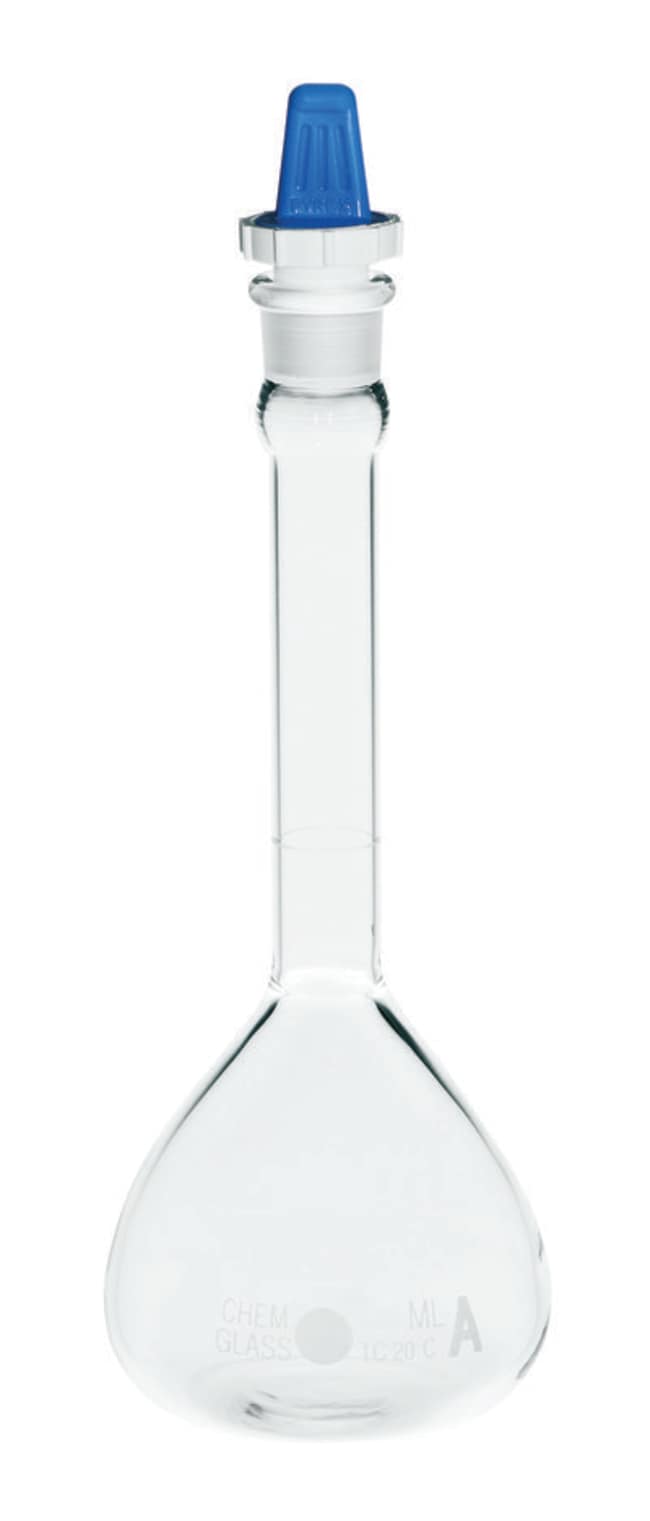 100mL Volumetric Flask, Class A, #13 Outer Stopper Neck, PE Stopper. Flasks are manufactured to conform to Federal Specifications NNN-F-289 for Type 1, Class “A” unserialized flasks and ASTM E-288. Supplied complete with one closed bottom polyethylene stopper. For additional stoppers, see CG-8740.