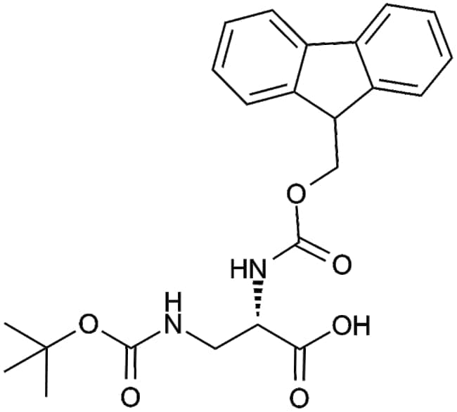 Fmoc-Dap Boc -OH is an amino acid derivative routinely used in solid-phase peptide synthesis to facilitate the introduction of diaminopropionic acid (Dap) units into peptide sequences The Fmoc group can be removed under standard deprotection conditions to expose a free amino functionality allowing subsequent peptide coupling Fmoc-Dap Boc -OH is particularly suitable for constructing cyclic and bicyclic peptides as well as peptide analogs targeting neurokinin NK2 receptor systems Based on these properties Fmoc-Dap Boc -OH holds research potential in pharmacological investigations and molecular studies involving receptor binding signaling pathways and receptor-ligand interaction analyses