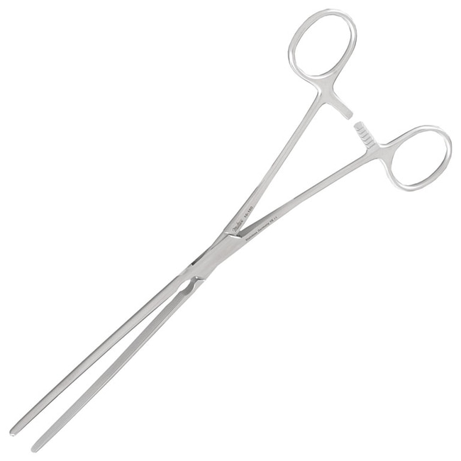 The Miltex 16-160 Doyen intestinal forceps are made of OR grade German stainless steel and measure 9" in length. They have a finger ring handle with a ratchet lock and straight, flexible blades with longitudinal serrations