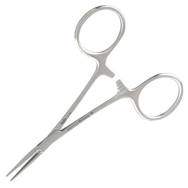 The Miltex 7-24 Hartman mosquito forceps are made of OR grade German stainless steel and measure 3.5" in length. They have a finger ring handle with a ratchet lock and straight tips that are serrated.