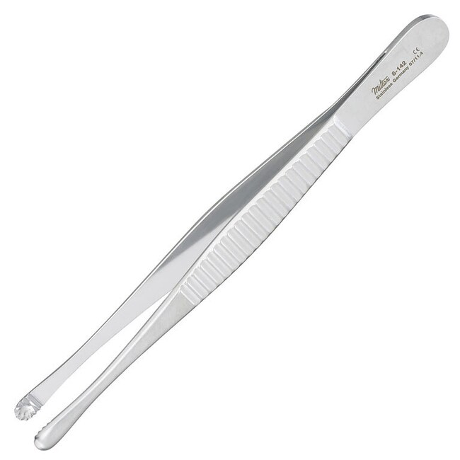 The Miltex 6-142 Russian tissue forceps are made of OR grade German stainless steel and measure 6" in length. They have a non-locking thumb handle and straight, serrated tips.