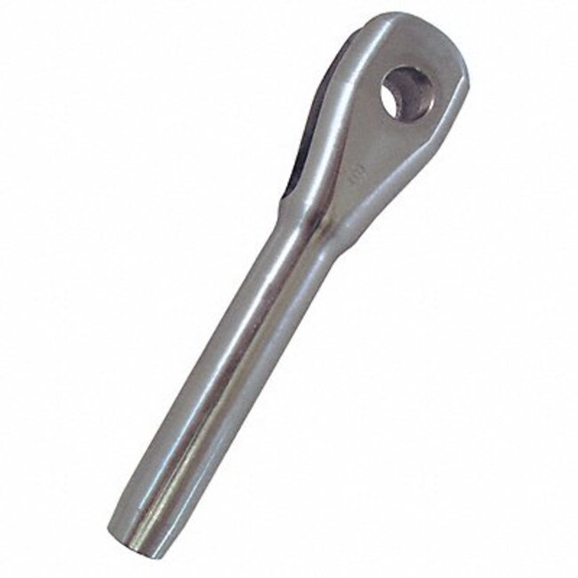 The Loos Wire Rope Clevis Fitting is a 1/16" clevis fitting made of forged steel with a zinc finish. It has a working load limit of 110 lbs and is rated for general purpose use. The clevis fitting accepts 1/16" diameter wire rope and features a threaded pin with cotter pin for securing the wire rope. Overall length is 1-1/4" with a 5/8" hole diameter. This clevis fitting is suitable for light duty applications like securing guy wires, attaching pulleys and creating adjustable wire rope lengths. Made in the USA by Loos & Co.