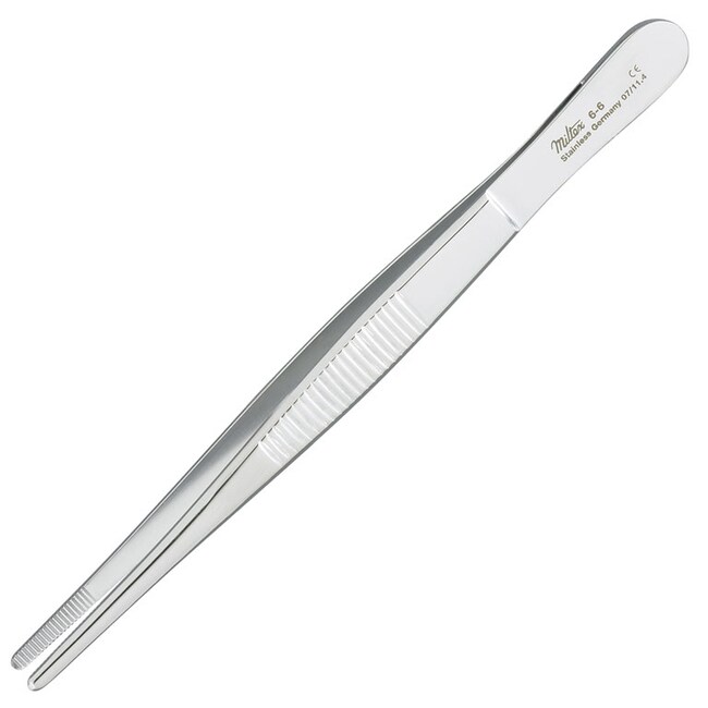 The Miltex 6-6 dressing forceps are made of OR grade German stainless steel and measure 5" in length. They have a non-locking thumb handle and straight, serrated tips.