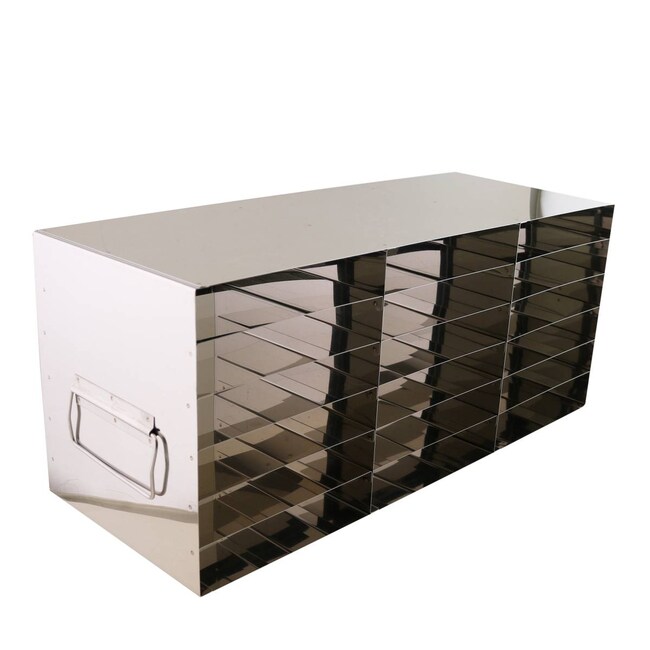 The slotted Microscope Slide Freezer Rack provides convenient storage for slide racks. Helps save time by keeping you organized in a cost efficient manner. The highest quality racks, constructed of corrosion resistant stainless steel, includes handles. Racks for 100 place slide boxes fit all 7 x 8 1/4 x 1 3/8 boxes.