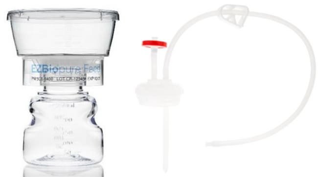 Foxx Life Sciences EZBiopure Feed System, a Single-Use solution designed for Filtration, Fluid Transfer, and Storage in Bioprocessing. This system combines the Autofil 2 Filtration Unit, EZBiopure TR Media Bottles, and TR Cap Assembly. All components are molded from USP Class VI materials and undergo Gamma Irradiation