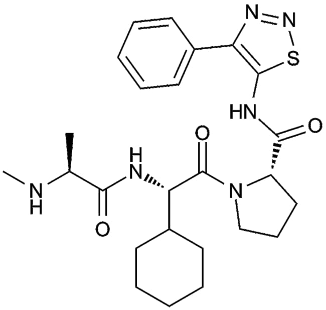 GDC-0152 (CAS 873652-48-3) is a small-molecule antagonist of inhibitor of apoptosis proteins (IAPs) including ML-IAP XIAP cIAP1 and cIAP2 It binds to the BIR domain of ML-IAP and the BIR3 domains of XIAP cIAP1 and cIAP2 with reported Ki values of 14 nM 28 nM 17 nM and 43 nM respectively GDC-0152 promotes degradation of cIAP1 and induces caspase-3/7 activation resulting in reduced viability of breast cancer cells while sparing normal epithelial cells In cellular models GDC-0152 disrupts interactions between XIAP and caspase-9 and between IAPs and Smac supporting its utility in apoptosis-related cancer research