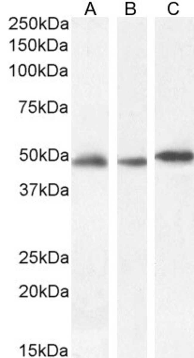 This antibody is predicted to react with canine and rat based on sequence homology. This antibody is tested in Peptide ELISA: antibody detection limit dilution 128,000.