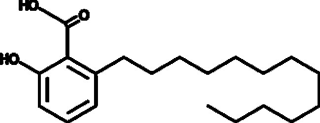 An anacardic acid with diverse biological activities; inhibits GPDH (IC50 = 3 μg/ml); inhibits PI3Kδ (IC50 = 2.49 μM) and IgE-mediated RBL-2H3 mast cell degranulation in vitro (IC50 = 2.4 μM); reduces S. mutans biofilm formation (MBIC50 = 4 μg/ml)