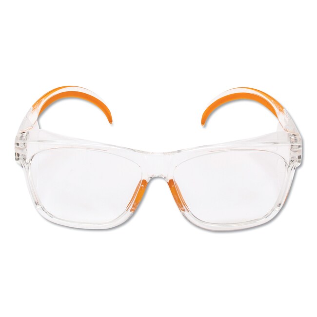 Maverick eye protection combines a modern sleek and trendy design with comfort and safety features Integrated side shields and browguard help the user feel confident they are protected Safety Glasses Style- Wraparound Frame Color- Clear/Orange Frame Material- Polycarbonate Lens Material- Polycarbonate