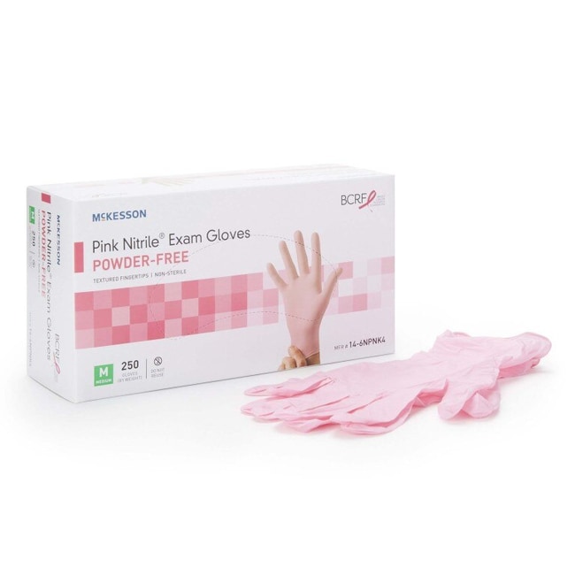 Exam Glove McKesson Pink Nitrile Medium NonSterile Nitrile Standard Cuff Length Textured Fingertips Pink Not Rated McKesson Pink Nitrile exam gloves are ambidextrous and nonsterile The gloves are durable and reduce tears and punctures Textured fingertips improve ability to grasp and hold onto items McKesson Pink Nitrile exam gloves have a standard cuff length, and a beaded cuff to prevent rolling They are not approved for chemo Single use powder-free gloves prevent hand residue and reduce irritation A conformed fit provides long-lasting comfort These gloves are pink in support of breast cancer research and awareness