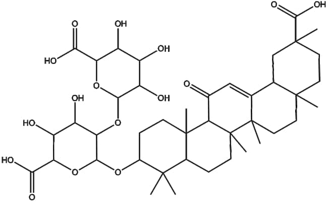 Glycyrrhizic acid (CAS 1405-86-3) is a triterpenoid saponin antagonist targeting high mobility group box 1 (HMGB1) and inhibitor of monoamine oxidase (MAO) as well as cytochrome P450 enzymes (CYP3A4 CYP2C9 CYP2C19) and 11 -hydroxysteroid dehydrogenase type 2 (11 -HSD2) It is designed to antagonize HMGB1-mediated pro-inflammatory responses and oxidative stress inhibit the enzymatic activity of MAO and 11 -HSD2 and modulate cytochrome P450-mediated metabolism Glycyrrhizic acid exerts its biological activity primarily through competitive inhibition of these enzymes It demonstrates MAO inhibition with an IC50 of approximately 0 16 M and competitively inhibits CYP3A4 (IC50 8 2 M) CYP2C9 ( 42 9 M) and CYP2C19 ( 40 3 M) Based on these pharmacological properties glycyrrhizic acid holds research potential in anti-inflammatory pathways enzyme inhibition and glucose metabolic modulation