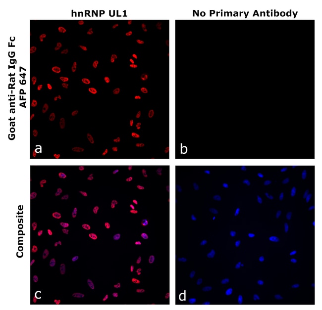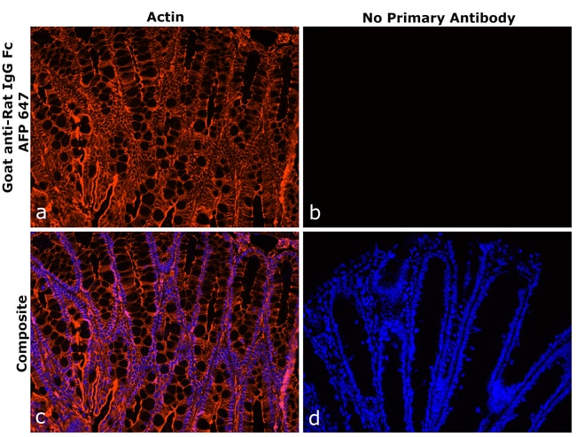 Goat anti-Rat IgG Fc Superclonal™ Recombinant Secondary Antibody, Alexa Fluor™ Plus 647 is specific to Fc fragment of Rat IgG. It can detect all subtypes of Rat IgG (Rat IgG1,2a,2b). It has <10% cross reactivity to Mouse IgG. It showed minimum to no cross-reactivity to various species immunoglobulins tested. Superclonal™ recombinant secondary antibodies are produced using a multifaceted clonal selection process that involves several phenotypic screens to ensure enhanced specificity, animal origin free formulation and lot-to-lot consistency. Alexa Fluor™ Plus dyes have been chemically optimized to provide higher signal to noise ratios and minimized cross-reactivity to help detect low-abundance targets in rare or precious samples. It is recommended that the antibody be carefully titrated for optimal performance in the assay of interest.