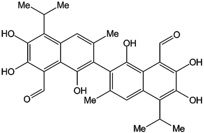 Gossypol (CAS 303-45-7) is a naturally occurring polyphenolic compound isolated from cotton plant tissues It is known to disrupt reproductive and immune functions through various biochemical pathways Mechanistically gossypol inhibits cAMP formation and progesterone secretion in bovine granulosa cells impairs sperm motility and hampers embryonic development in vitro in a dose-dependent manner In murine lymphocytes it suppresses proliferation and induces apoptosis of T and B cell subsets In vivo studies in rodents indicate hepatotoxicity and alterations in hepatic enzyme activity at certain dosages Gossypol is widely used in biomedical research to study cell signaling reproductive biology and immune modulation