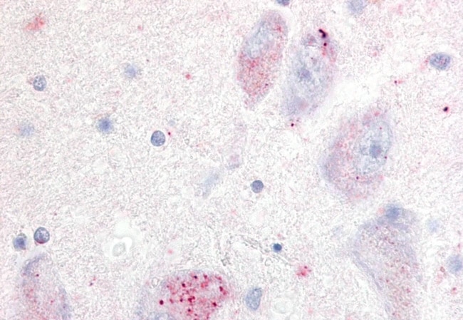 Percent identity with other species by BLAST analysis: Human, Bovine (100%); Gorilla, Monkey, Marmoset, Mouse, Horse, Rabbit, Dog, Bat (94%); Hamster, Elephant (89%); Rat (83%). For IHC(P), use heat induced antigen retrieval in pH 6.0 citrate buffer. After incubation with the primary antibody, slides were incubated with biotinylated secondary antibody, followed by alkaline phosphatase-streptavidin and chromogen.