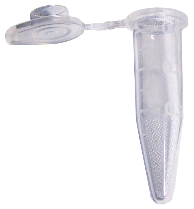 Micro-Centrifuge Tubes have molded external graduation marks at 100µl increments that are clear and easy to read, similar in style to marks used on graduated glassware. Tubes have a flat frosted top and a frosted marking area on the side of tube for writing. Hinged lid provides a soft piercing point for inserting a needle. Made from a clear copolymer designed for high speed centrifugation and boiling.