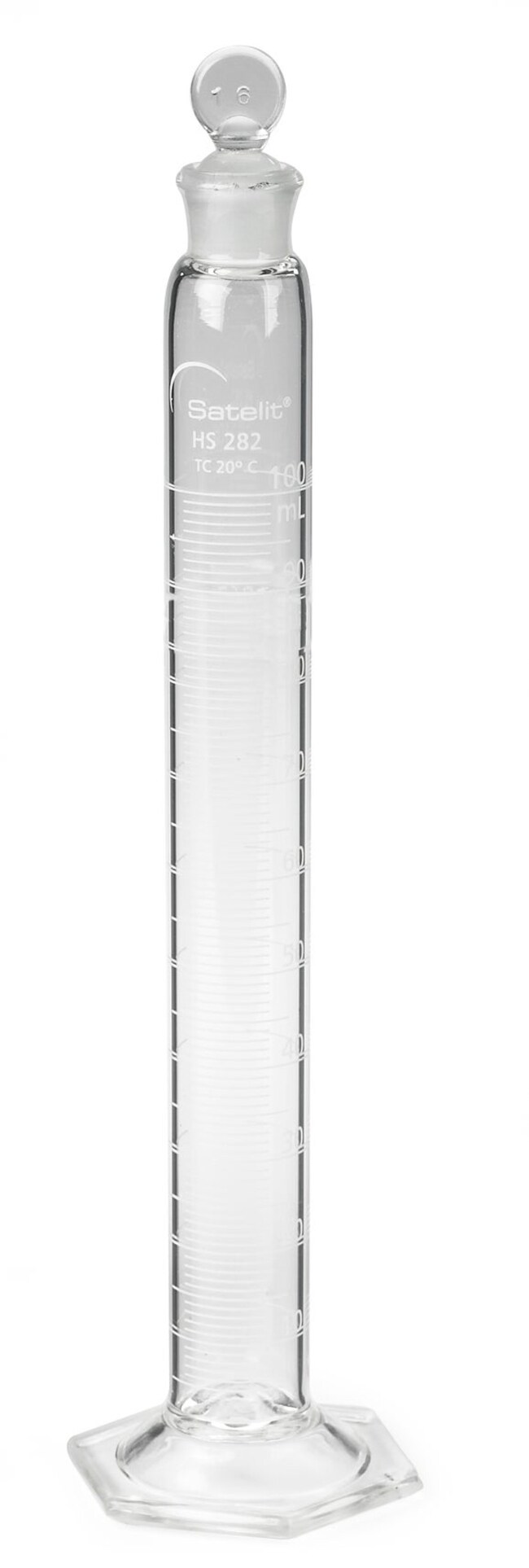 Graduated Cylinder for mixing Glass 100 mL -0 6 mL with 1 0 mL divisions and glass stopper 16This glass graduated cylinder is calibrated to contain with a molded in base Each includes glass penny head stopper Graduations are in durable white enamel bake