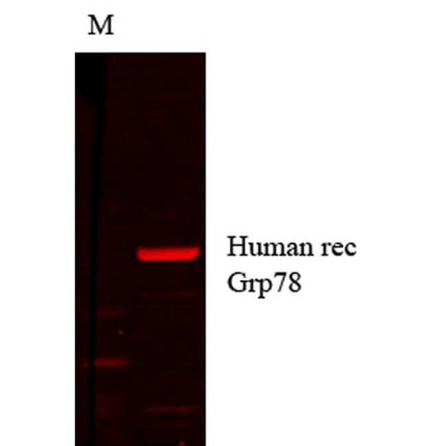 0.5 μg/mL of MA5-45278 was sufficient for detection of Grp78 in 10 μg of rat tissue lysate by ECL immunoblot analysis. Detects approximately 78kDa.