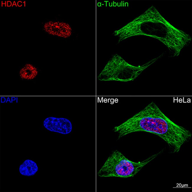 Histone acetylation and deacetylation, catalyzed by multisubunit complexes, play a key role in the regulation of eukaryotic gene expression. HDAC1 belongs to the histone deacetylase/acuc/apha family and is a component of the histone deacetylase complex. It also interacts with retinoblastoma tumor-suppressor protein and this complex is a key element in the control of cell proliferation and differentiation. Together with metastasis-associated protein-2, HDAC1 deacetylates p53 and modulates its effect on cell growth and apoptosis.