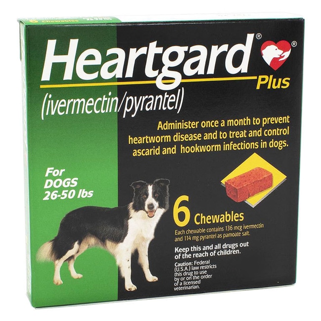 Med Vet International Heartgard Plus Chewables For Dogs, 26-50 Lbs., Green, 6 Monthly Doses