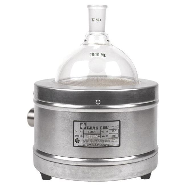 The Chemglass Glas-Col Series TM 1000 mL spherical heating mantle (CG-12000-08CE) is a hemispherical, aluminum-housed mantle designed to heat 1 L spherical flasks. It provides 380 W of heating power and is supplied with a 230 V Euro plug; the unit is intended for use with an external temperature controller (thermocouple or RTD) and is not designed to be directly connected to a wall receptacle.