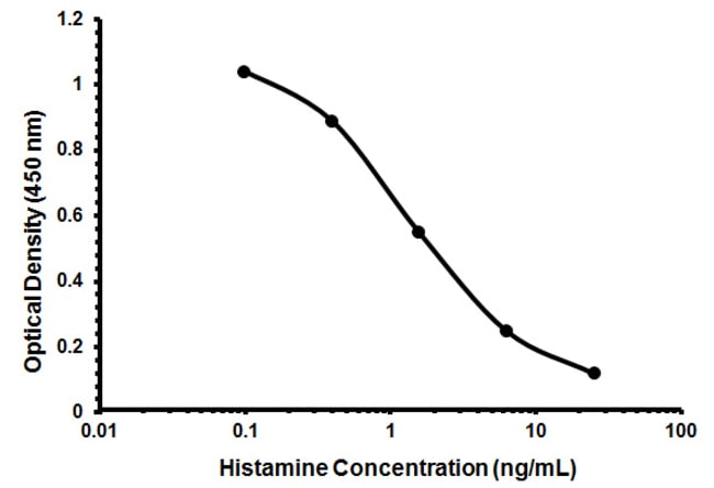 The Histamine ELISA kit (colorimetric) is a competitive ELISA designed to quantify mouse, rat and human histamine (HIS) with a sensitivity of 0.068 ng/mL. - Wide dynamic range – quantifies 0.098–25 ng/mL - Compatible with multiple sample types – works with serum, EDTA plasma, urine, and cell culture media - Fast assay time – complete results in 2 hours 30 minutes - Cited in over 20 publications