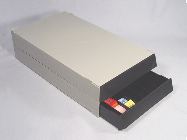 Individually, self-contained, stackable drawers. They hold approximately 250 Histo-cassettes or embedding rings. Supplied in economical two-drawer packages with interlocking ridges on the top and the bottom for easy stacking of as many cabinets as you want. Each drawer is encased in a rugged, high impact plastic sleeve, so your cassettes are completely enclosed and protected. They come with color decals which allow you to organize each by function. Cassettes are not included.