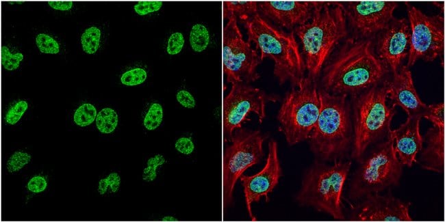 Recommended positive controls: 293T, A431, HeLa, HepG2, NIH-3T3, JC, BCL-1, C2C12, Raw264.7, PC-12, HMGB1-transfected 293T. Predicted reactivity: Mouse (100%), Rat (100%), Xenopus laevis (93%), Dog (100%), Pig (100%), Rabbit (100%), Chicken (94%), Rhesus Monkey (100%), Bovine (100%). Store product as a concentrated solution. Centrifuge briefly prior to opening the vial.