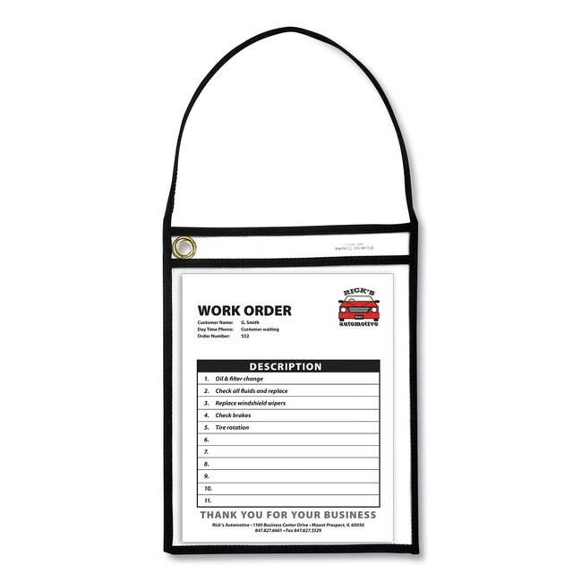 Store protect and organize your instructions production schedules inventory cards work orders and much more The convenient strap allows you to hang the job ticket on a car mirror or factory machine while you are working on the job Great for hooks pegs vehicle mirrors or machinery Super heavyweight holder has stitched seams for long-lasting utility Keep the information with the job This product will be cheerfully replaced with one of equal value if defective in materials manufacturing or packaging at the time of purchase 22 Black Hang Strap Load Orientation- Top Document Size Range- Letter Insert Size- 9x12 Front Face Color- Clear