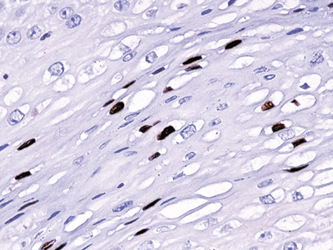 The broad spectrum HPV antibody was produced (1H8) against SDS-disrupted bovine papillomavirus type 1 (BPV-1) and used to identify the product of the L1 open reading frame (ORF) of BPV-1. IH8 was found to be reactive with purified major capsid protein (MCP). The antibody was tested with ELISA and with an immunofluorescent technique and detected HPV-1, 6, 11, 16, 18, and 31 in formalin-fixed paraffin embedded biopsy specimens. The CAMVIR-1 antibody was raised against the major capsid protein L1 of human papillomavirus type 16, using a recombinant vaccinia virus that expresses the L1 protein, as a target for screening. This antibody reacted with a 56 kilodalton protein in cells infected with L1-vaccinia virus, and the protein was present in HPV16. A panel of p16 and Ki-67 can be used for further evaluation. CAMVIR-1 may also be used separately for phenotyping HPV-16. Other HPV isotypes may also be reactive with the Broad Spectrum HPV antibody, but have not been tested.