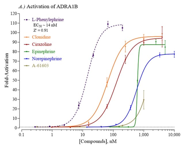 Indigo Biosciences Human Adrenoceptor Alpha 1B (ADRA1B) All-inclusive Cell-Based Luciferase Reporter Assay Kit, 384-well assay plate format