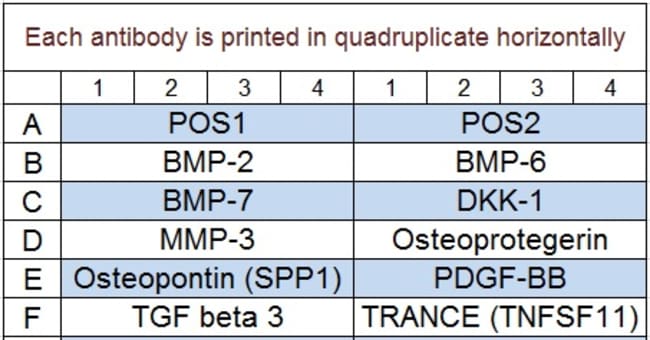Detects 10 Human Cytokines. Suitable for all liquid sample types. Quantitative, Sandwich-based, Glass Slide Antibody Array. Simultaneous quantitative measurement of multiple proteins in a wide variety of sample types. Quantibody combines the high specificity and sensitivity of ELISA with the high throughput of the glass chip-based array. Less sample, more data: only 50 ul of sample is needed for quantification of up to 40 cytokines. Proteins detected: BMP-2, BMP-6, BMP-7, DKK-1, MMP-3, Osteoprotegerin (TNFRSF11B), Osteopontin (SPP1), PDGF-BB, TGF beta 3, TRANCE (TNFSF11)