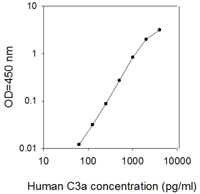 For Serum, Plasma, and Cell Culture Supernatants. Sensitivity: 63 pg/ml. Pre-coated 96-well strip plate with additional reagents to allow for use in multiple experiments. Specificity: This ELISA antibody pair recognizes Human C3a.