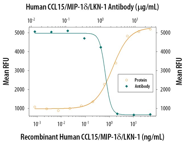 Detects human CCL15/MIP-1 delta in direct ELISAs and Western blots. In direct ELISAs and Western blots, a preference for the 68 aa residue isoform over the 92 aa residue isoform of human CCL15/LKN-1 is shown. Additionally, in direct ELISAs, less than 1% cross-reactivity with with rh6Ckine, rhBLC/BCA1, rhENA78, rhEotaxin, rhEotaxin2, rhFractalkine, rhGCP2, rhGRO alpha , rhGRO beta , rhGRO gamma , rhHCC1, rhHCC4, rhI309,rhIL8, rhMCP1, rhMCP2, rhMCP3, rhMCP4, rhMDC, rhMIG, rhMIP1 alpha , rhMIP1 beta , rhMIP3 alpha , rhMIP3 beta , rhMPIF1, rhNAP2, rhPARC, rhRANTES, rhSDF1 alpha ,rhSDF1 beta ,rhTarc, rhTECK, and rhVIC is observed. Neutralizes the biological activity of the 68 aa isoform of recombinant human (rh) CCL15/LKN-1. It will also neutralize the biological activity of the 92 aa residue isoform of rhCCL15/LKN-1 using a 2-fold higher Ig concentration. | |