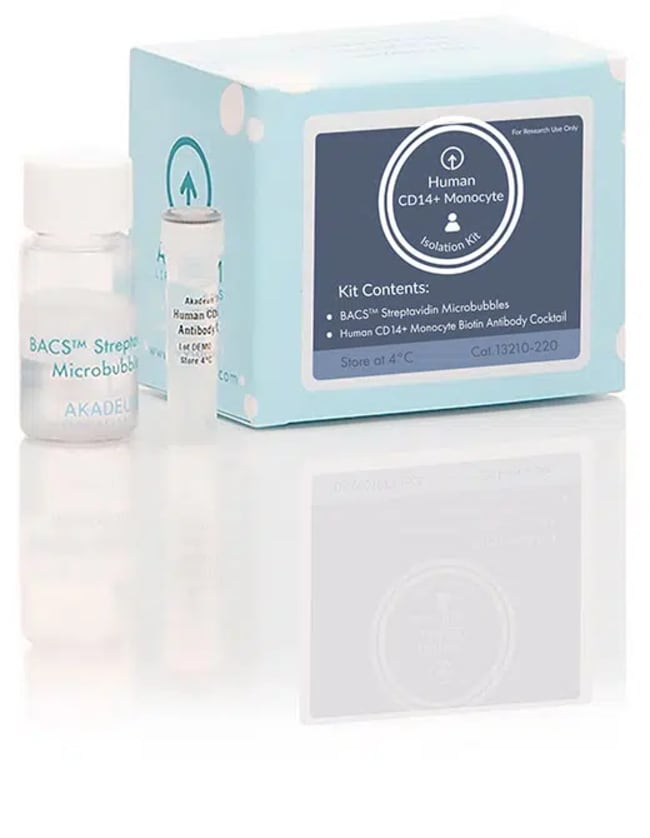 The Human CD14+ Monocyte Isolation Kit delivers a high purity population of classical human monocytes that are ready for downstream use. The buoyancy-based BACS™ Microbubble workflow is exceptionally gentle on cells, helping to maintain the health and physiology of monocytes during enrichment. The kit uses a negative selection method to remove unwanted cell populations and effectively enrich CD14+ monocytes, without the need for magnets. Unwanted cells are labeled with an optimized cocktail of biotinylated antibodies targeting CD3, CD5, CD15, CD16, CD19, CD20, CD56, CD57, CD66b, CD123, CD235ab, CD314. BACS™ Microbubbles are added and bind to the antibody-labeled cells, then quickly and gently float the undesired cells to the surface. CD14+ monocytes, the cells of interest, are pelleted through centrifugation. Capacity: 1 billion cells.