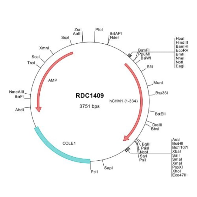 This shuttle vector contains the complete ORF for the gene of interest, along with a Kozak consensus sequence for optimal translation initiation. It is inserted NotI to AscI. The gene insert is flanked with convenient multiple cloning sites which can be used to easily cut and transfer the gene cassette into your desired expression vector.