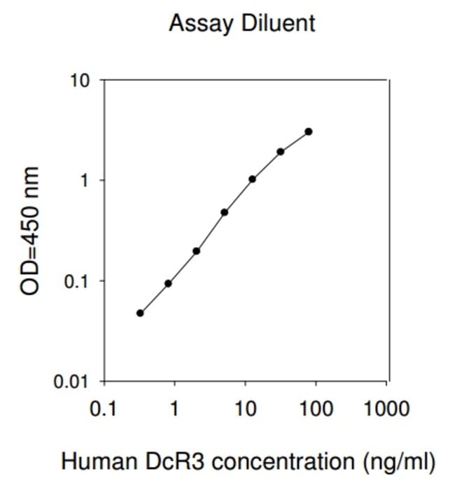 For cell culture supernatants, EDTA and/or Citrate treated plasma, and serum samples. Heparin is not recommended as an anticoagulant For use in this assay. Sensitivity: 0.3 ng/ml. Pre-coated 96-well strip plate with additional reagents to allow for use in multiple experiments. Specificity: This ELISA antibody pair detects human DcR3. Other species not determined.