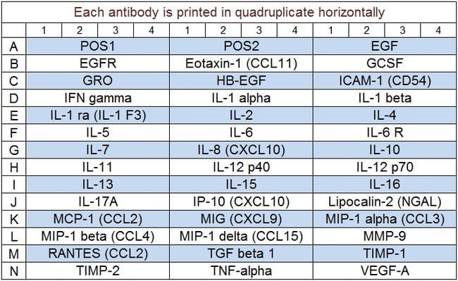 Detects 40 DED associated cytokines. Suitable for all liquid sample types. Quantitative, Sandwich-based, Glass Slide Antibody Array. Simultaneous quantitative measurement of multiple proteins in a wide variety of sample types. Quantibody combines the high specificity and sensitivity of ELISA with the high throughput of the glass chip-based array. Less sample, more data: only 50 ul of sample is needed for quantification of up to 40 cytokines. Proteins detected: EGF, EGFR, Eotaxin-1 (CCL11), GCSF, GRO alpha/beta/gamma, HB-EGF, ICAM-1 (CD54), IFN-gamma, IL-1 alpha (IL-1 F1), IL-1 beta (IL-1 F2), IL-1 ra (IL-1 F3), IL-10, IL-11, IL-12 p40, IL-12 p70, IL-13, IL-15, IL-16, IL-17A, IL-2, IL-4, IL-5, IL-6, IL-6 R, IL-7, IL-8 (CXCL8), IP-10 (CXCL10), Lipocalin-2 (NGAL), MCP-1 (CCL2), MIG (CXCL9), MIP-1 alpha (CCL3), MIP-1 beta (CCL4), MIP-1 delta (CCL15), MMP-9, RANTES (CCL5), TGF beta 1, TIMP-1, TIMP-2, TNF alpha, VEGF-A